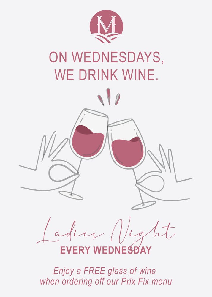 Wednesday's are for the Ladies! Join us in the Steakhouse or Tavern on Wednesdays and receive a FREE glass of wine when ordering off the the Prix Fix Menu